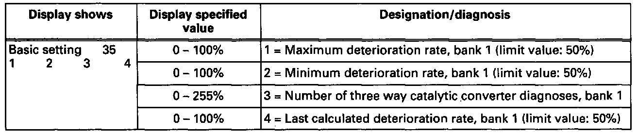 - If the value of the three way catalytic converter diagnosis is not set to "0" in display group 029, display field 1 during regeneration of the readiness code and/or there is a malfunction in DTC memory that relates to the three way catalytic converter, display groups 035, 035 and 044 are used to carry out a selective diagnosis.
