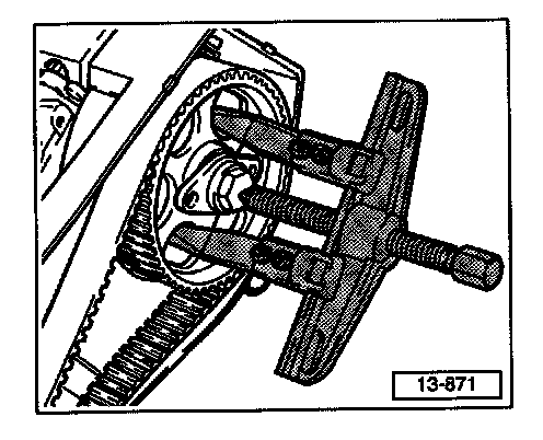 - Loosen right and left camshaft sprockets from tapered ends of camshafts using puller (Kukko 20/10 shown).