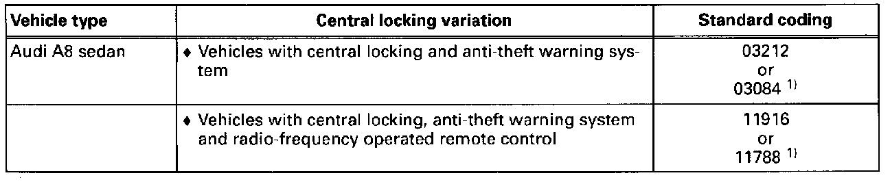 - Basic functions of the central locking system variations are listed in the standard coding table. See below.