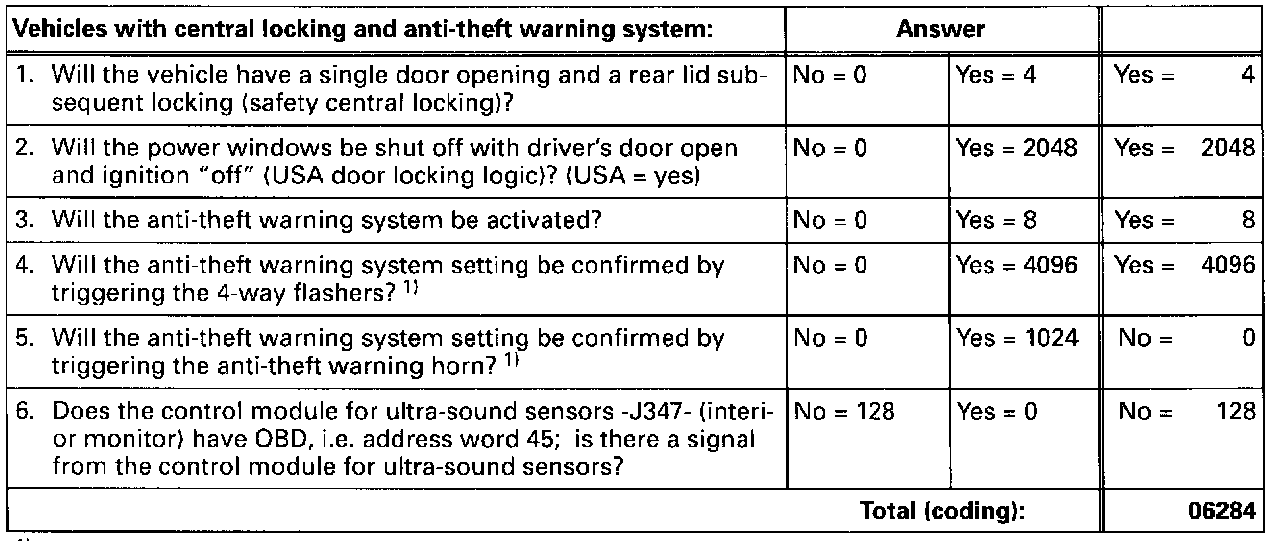- If a customer requests a special, individual coding of the central locking system, use the questions see below to determine the correct system coding.