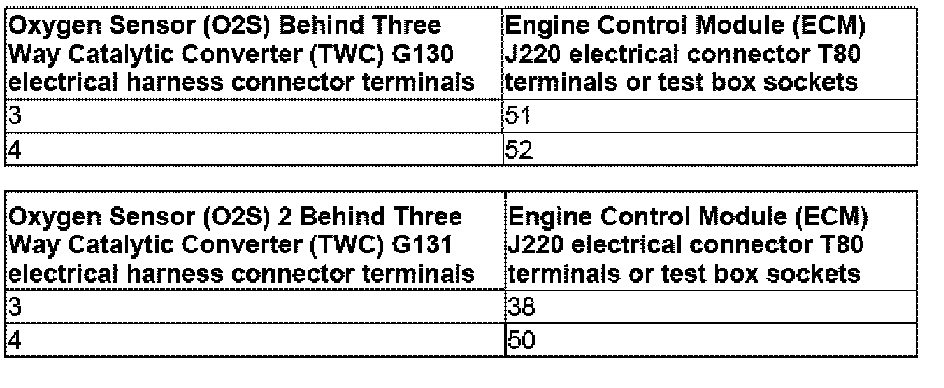 - Using a Multimeter, check the Oxygen Sensor (O2S) Behind Three Way Catalytic Converter (TWC) G130 electrical harness connector terminals to the Engine Control Module (ECM) J220 or Oxygen Sensor (O2S) 2 Behind Three Way Catalytic Converter (TWC) G131 electrical harness connector terminals for an open circuit.