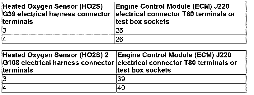- Using a Multimeter, check the Heated Oxygen Sensor (HO2S) G39 or the Heated Oxygen Sensor (HO2S) 2 G108 electrical harness connector terminals to the Engine Control Module (ECM) J220 electrical harness connector terminals for an open circuit.