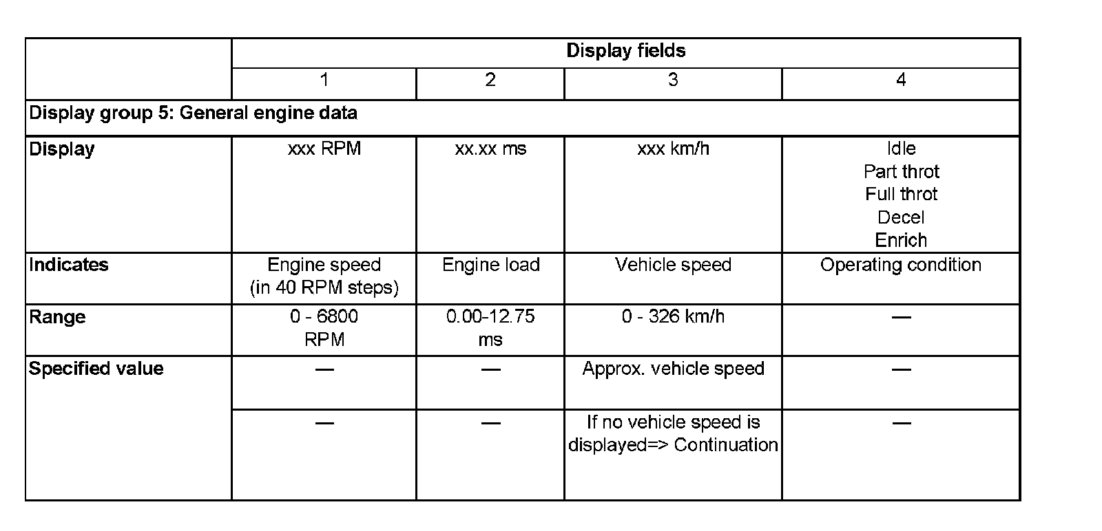 - Road test and compare indicated vehicle speed with value in display field 3 (2nd technician required, See Safety precautions).