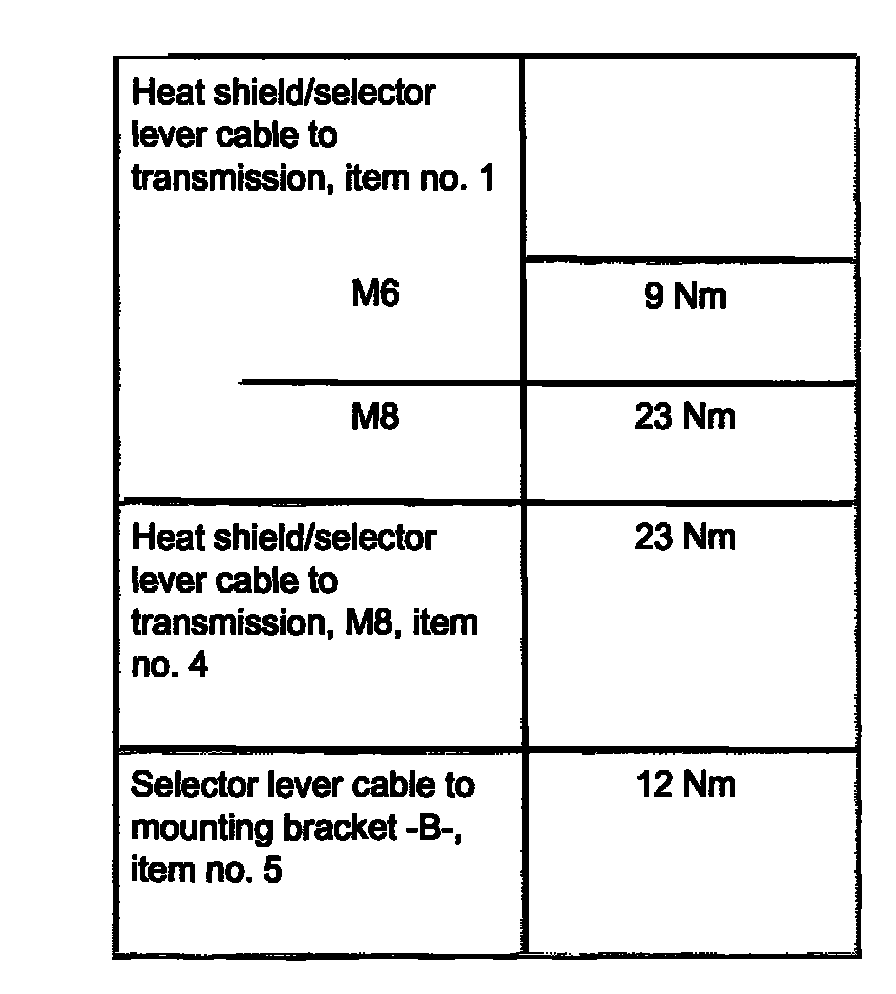 Selector lever cable to bracket 12 Nm (9 ft. lbs.)