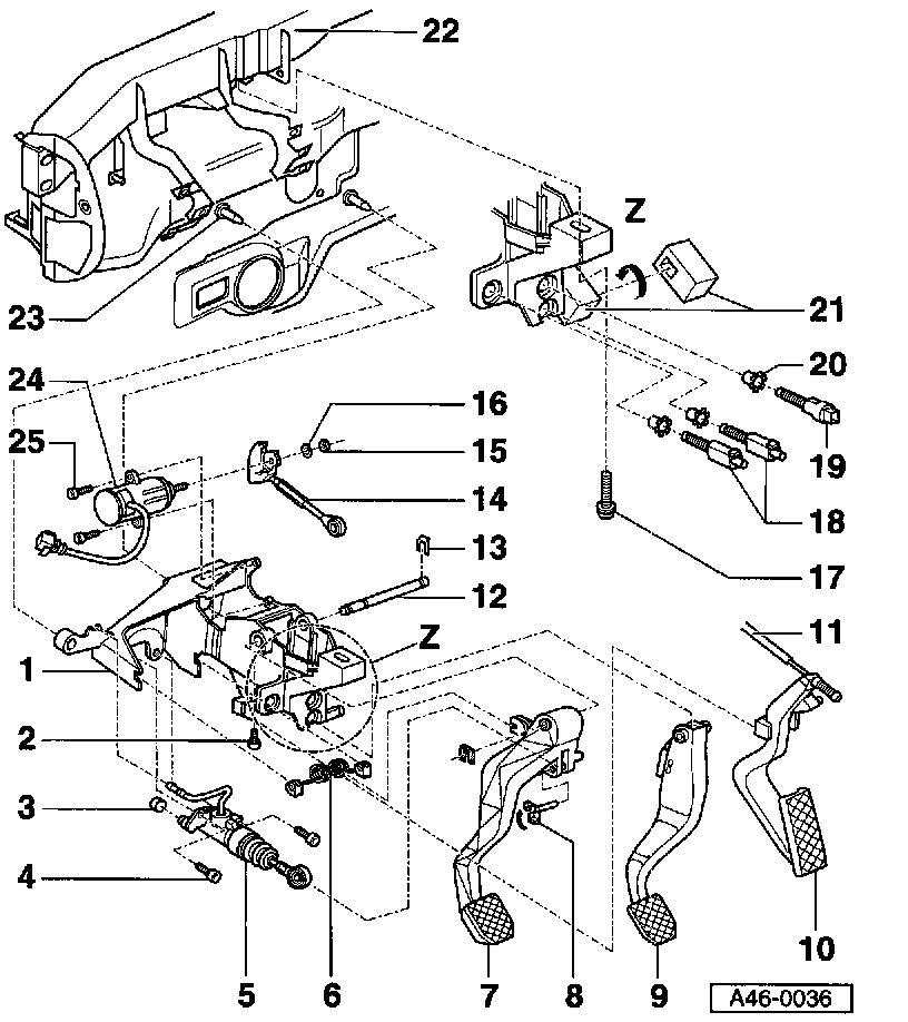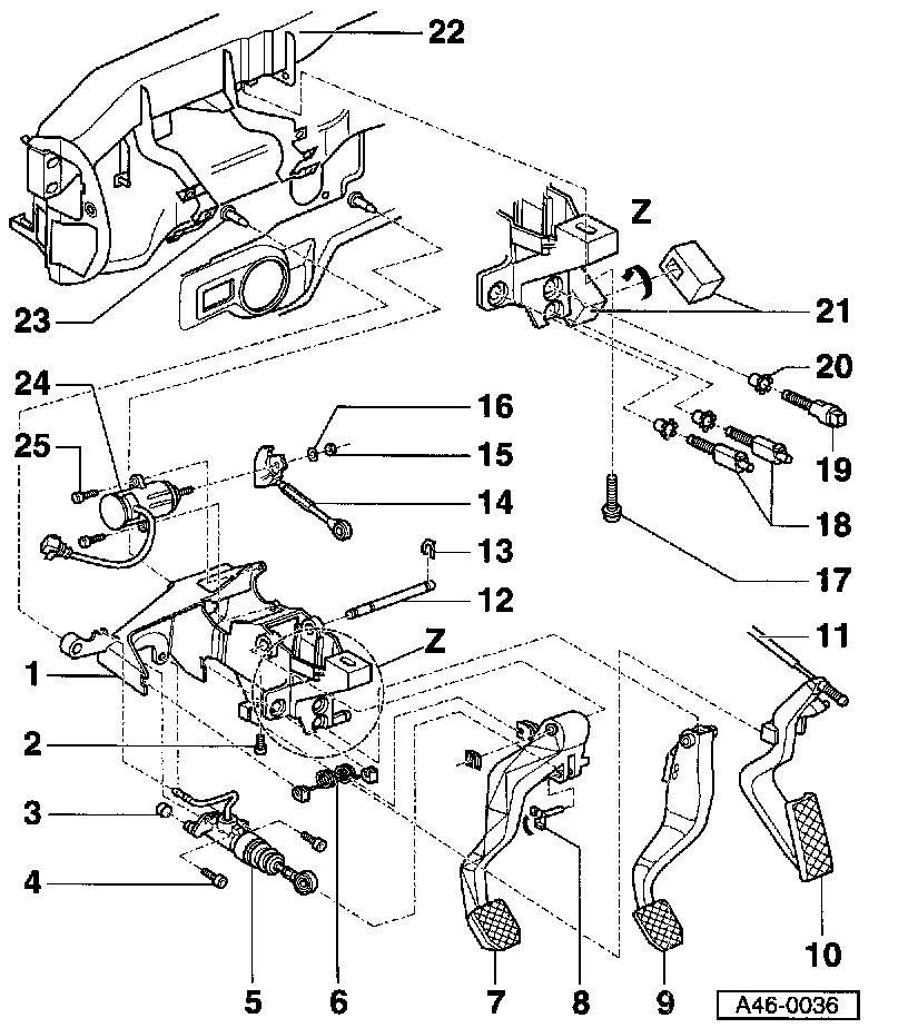 Note: Between the nut and the pedal bracket there is a spring clip (not shown), Part No. N 012 042 4.