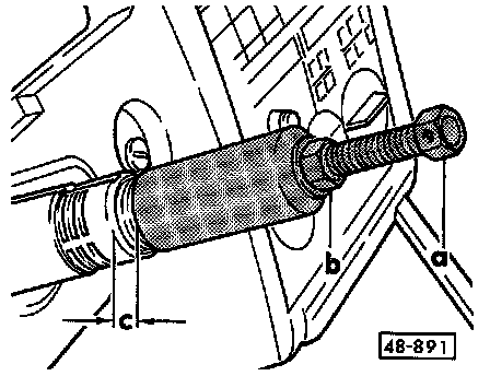 - Hold spindle (a in illustration) and tighten hex nut (b in illustration) to compress spring until reaching specified dimension (c in illustration) (between end of steering column tube and end of special tool).