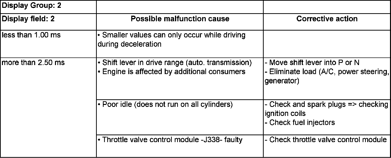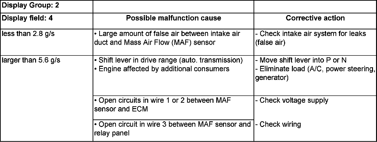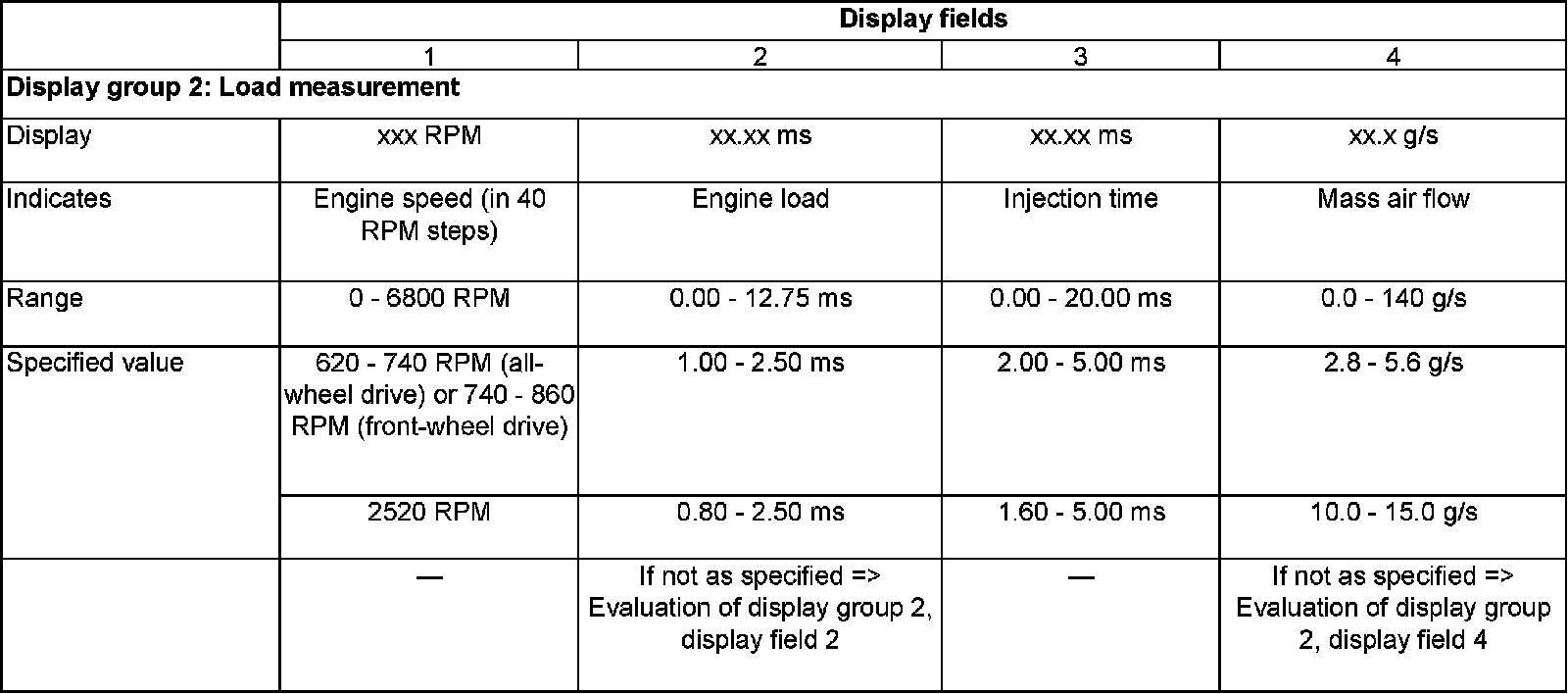 - Compare display with specified values for engine load (display fields 2 and 4):