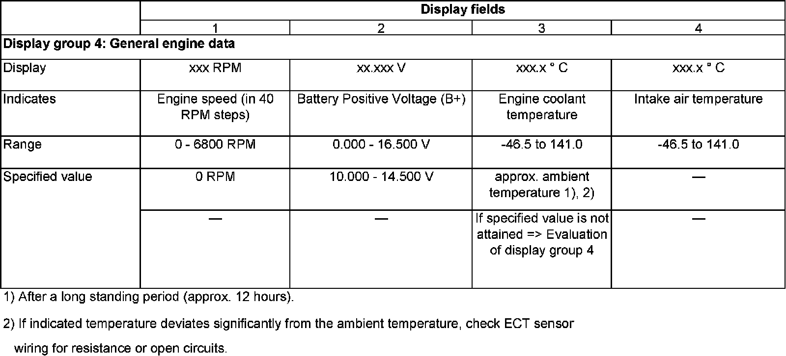 - Compare display with specified value for engine coolant temperature sensor (display field 3):
