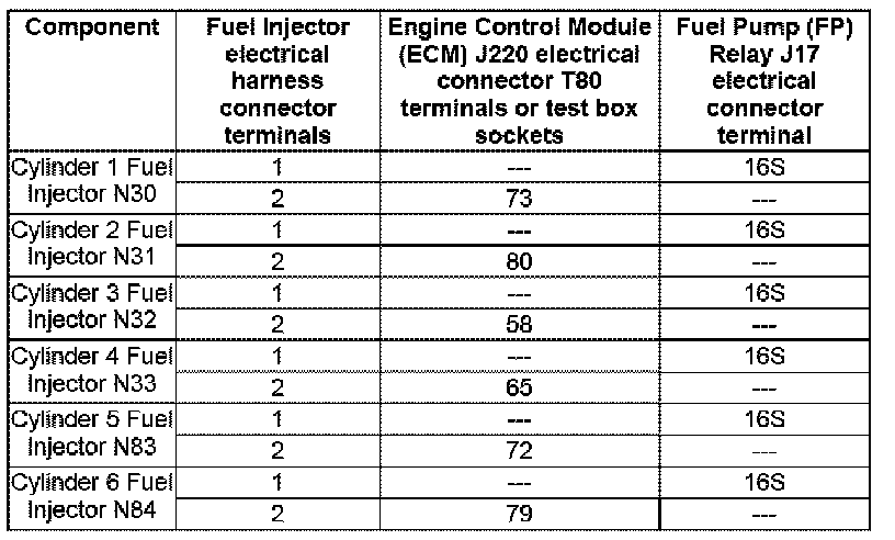 The following test procedure is used to diagnose Fuel Injectors N30, N31, N32, N33, N83, N84.