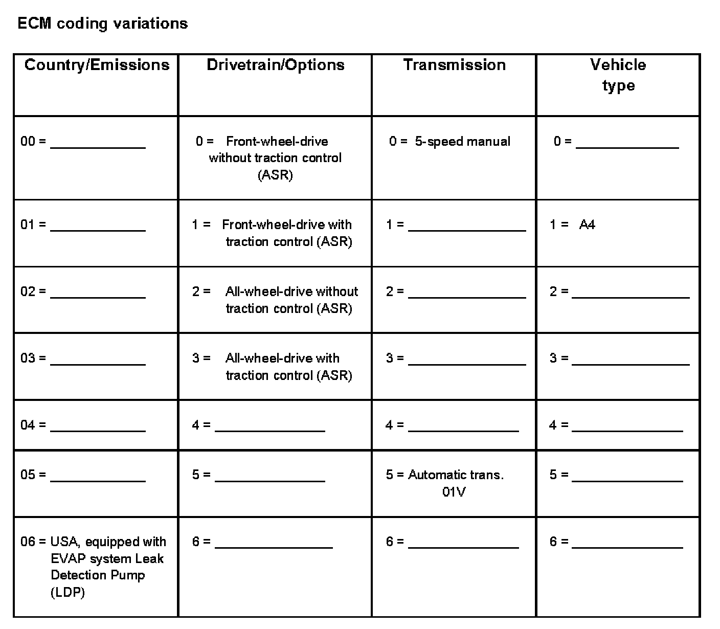 If vehicle coding information is not as specified, or if the ECM has been replaced, the ECM must be coded as follows.