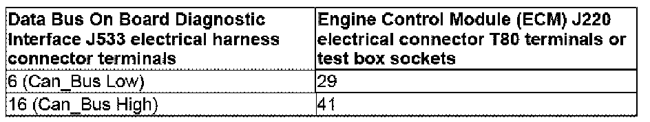 - Using a Multimeter , check the Data Bus On Board Diagnostic Interface J533 electrical harness connector to the Engine Control Module (ECM) J220 electrical harness connector for resistance.