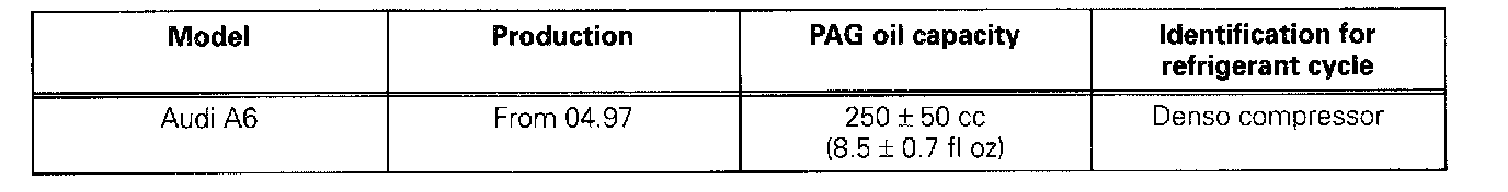 - The refrigerant oil capacity is given for a complete system with the Denso compressor. Replacement compressors supplied by the Audi parts department are filled with an amount equal to the capacity of the entire system.