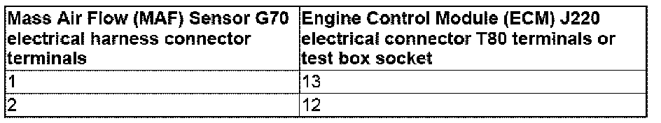 - Using a multimeter, check the Mass Air Flow (MAF) Sensor G70 electrical harness connector terminals to the Engine Control Module (ECM) J220 electrical harness connector T80 terminals for an open circuit.