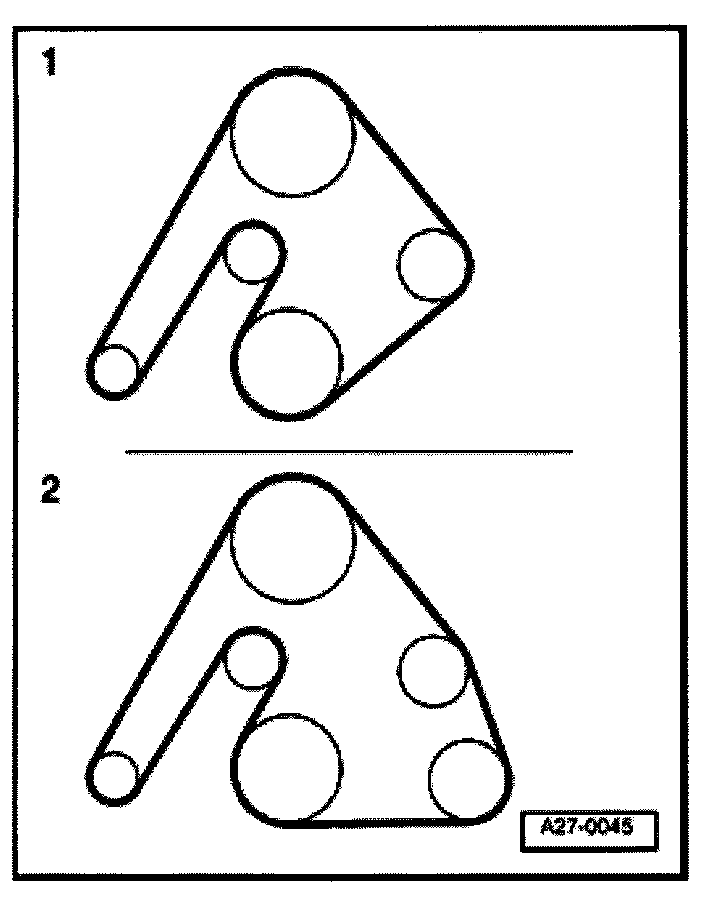 - Rotate tensioner for ribbed belt toward right using box wrench until both holes are in alignment (lower arrows), and secure in place using 3204 drift.