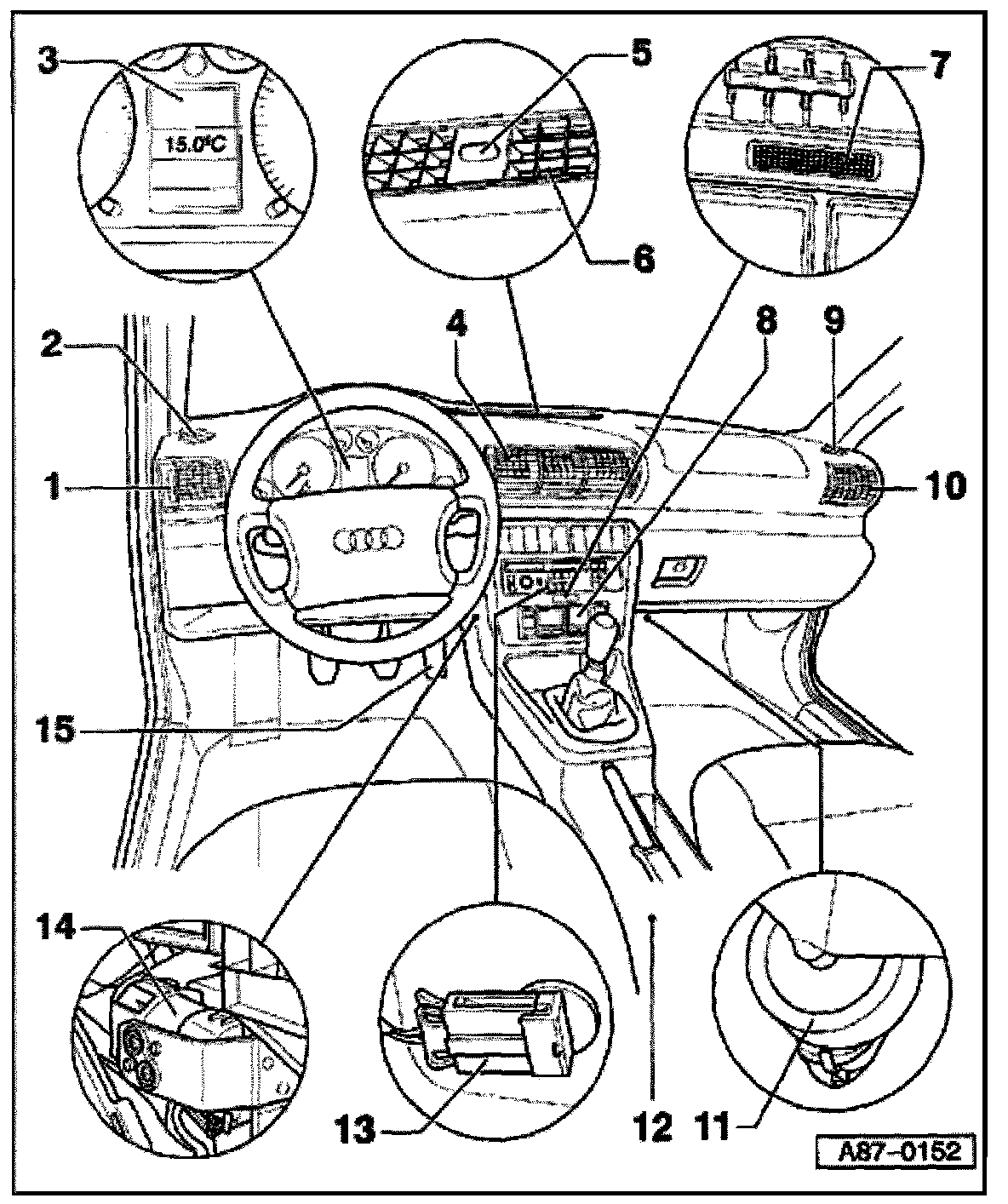 - Always confirm proper coding of A/C control head -E87- (engine type dependant) before diagnosis and repairs.