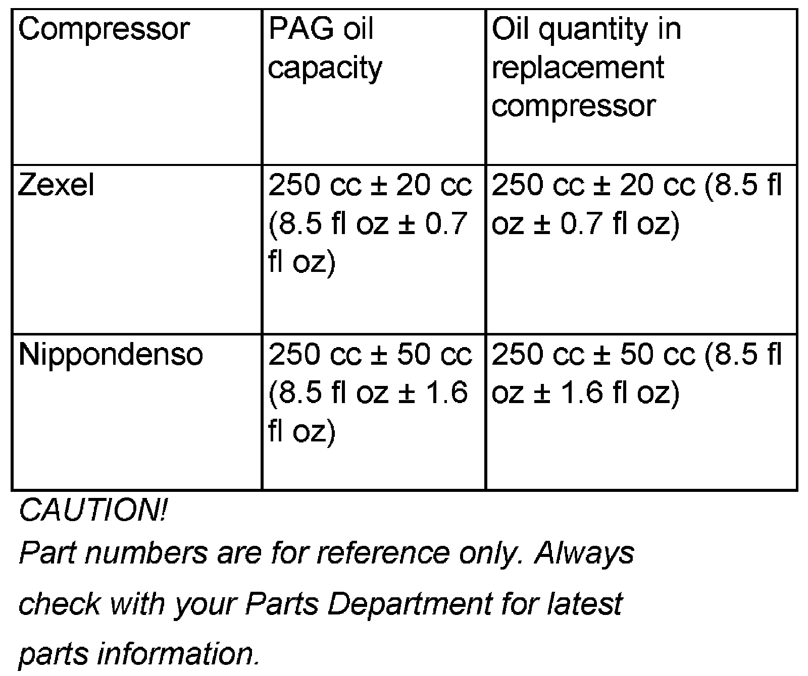 - Replacement A/C compressors supplied by the Parts Department are filled with 250 cc ± 20 cc (8.5 fl oz ± 0.7 fl oz) of refrigerant oil. This is the total A/C system refrigerant oil capacity.