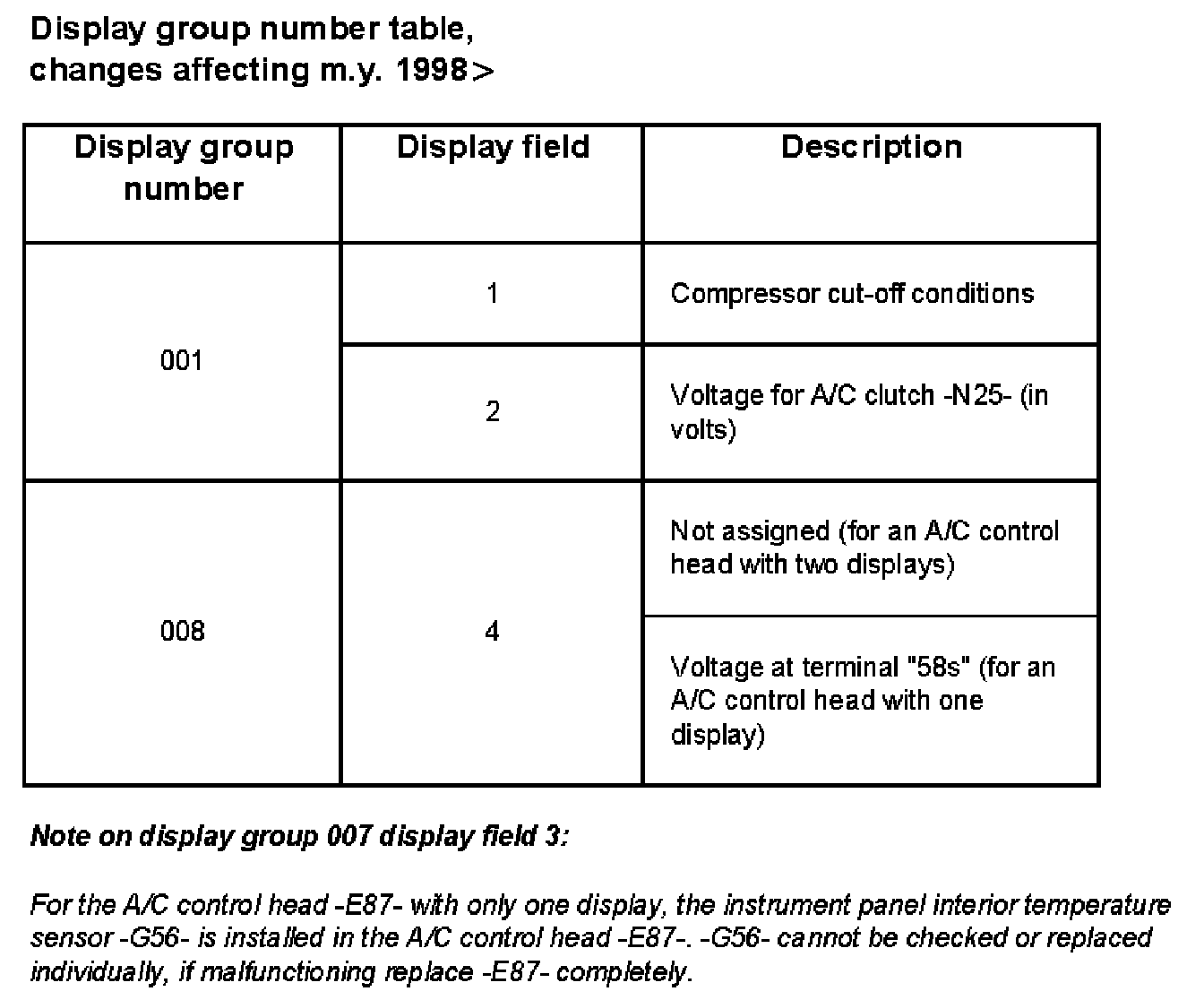 Display group number table, changes affecting m.y. 1998 On.