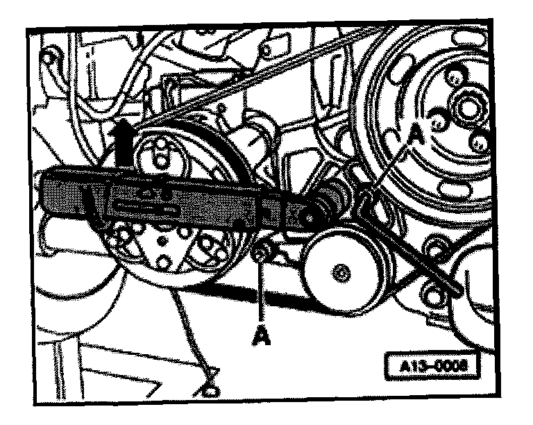 - Maintain torque on belt tensioner and tighten bolt -A- to 20 Nm (15 ft lb).