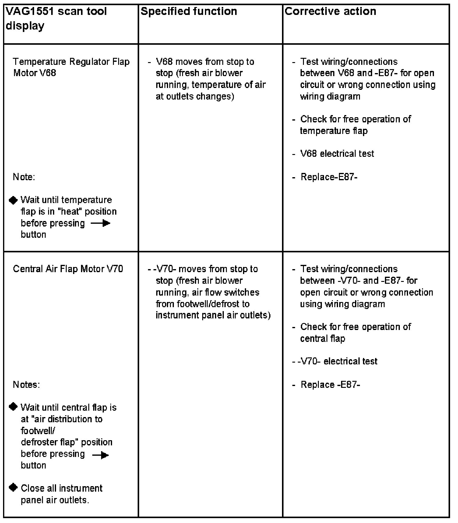 - When starting Output DTM, temperature and air distribution flap flap motors move to predetermined positions in preparation for individual tests: Temperature Regulator Flap Motor V68: moves to "heat" position. Central Air Flap Motor -V70- moves to "floor & defroster outlet" position. Footwell Defroster Flap Motor V85 moves to "defrost" position.