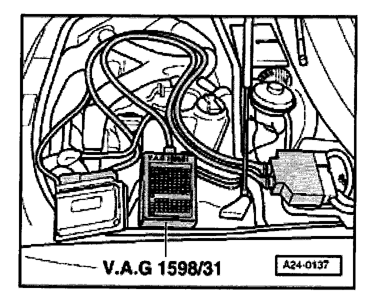 - Connect VAG1598/31 test box to wiring harness for engine control module. Do not connect to the engine control module itself. Refer to "Scan Tool Testing/Scan Tool Connecting and Initial Checks/Connecting VAG1598/31 Test Box" Testing and Inspection