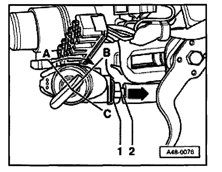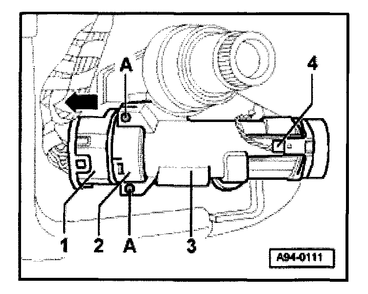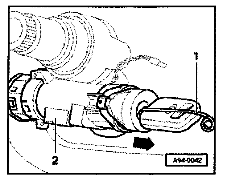 - Insert steel wire or pin (approx. 1.5 mm dia.) -1-, as illustrated up to stop while pulling lock cylinder with induction coil out of steering column housing -2- in direction of arrow.