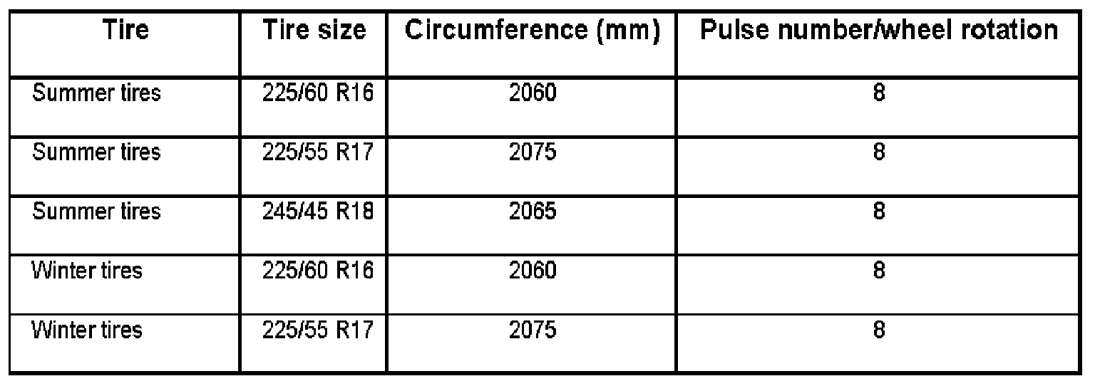 - Enter new tire circumference, adding one zero to the four-digit number (e.g. 1910 becomes 01910). See Tire table.