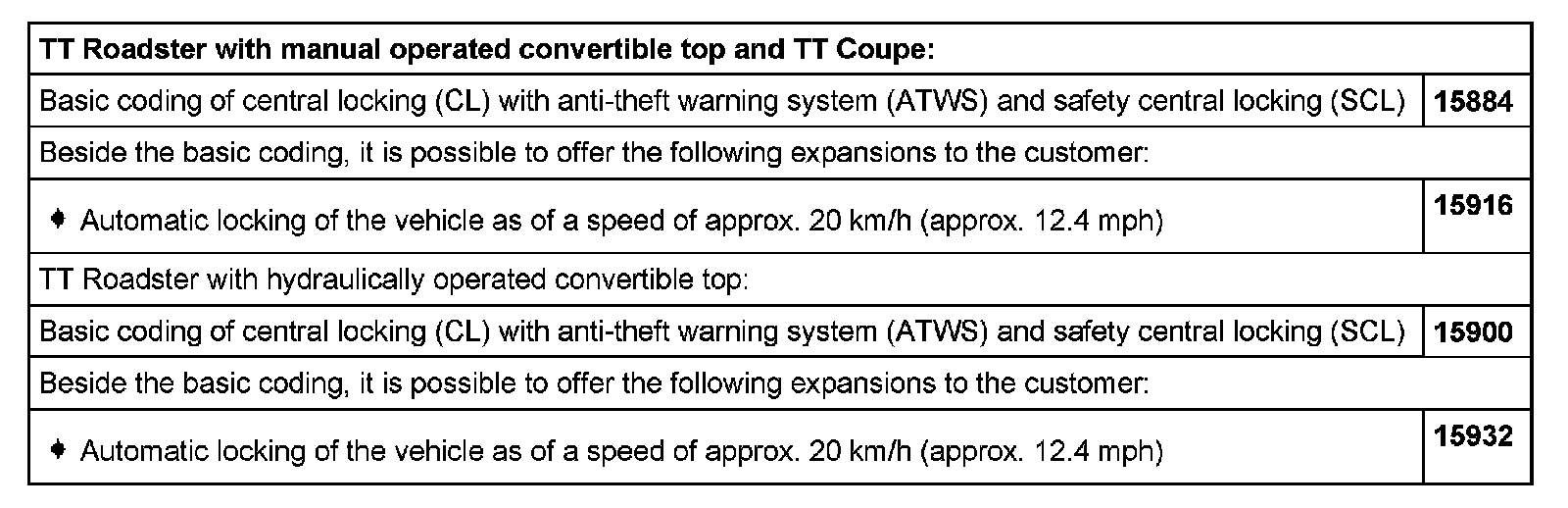 - Enter coding of control module for central locking for TT Coupe and TT Roadster with manually operated convertible top or hydraulically operated convertible top via keypad: e.g.: