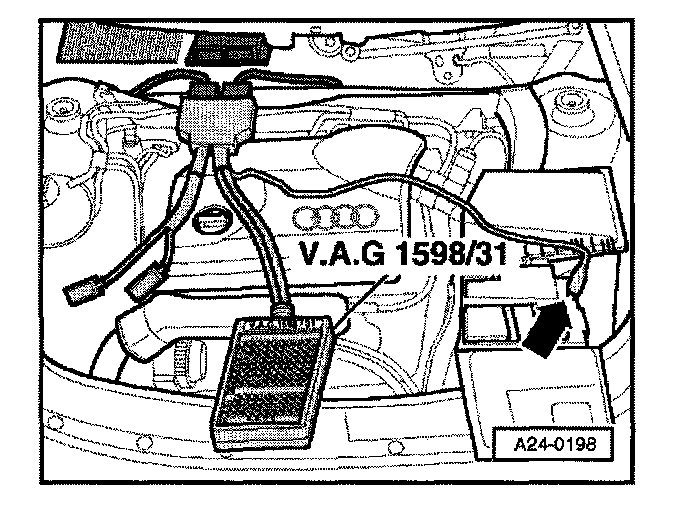- Connect VAG 1598/31 test box to connector of wiring harness. Ground clip (arrow) at test box must be clipped to battery negative terminal. Relevant test procedures note whether Engine Control Module (ECM) should also be connected to the test box.