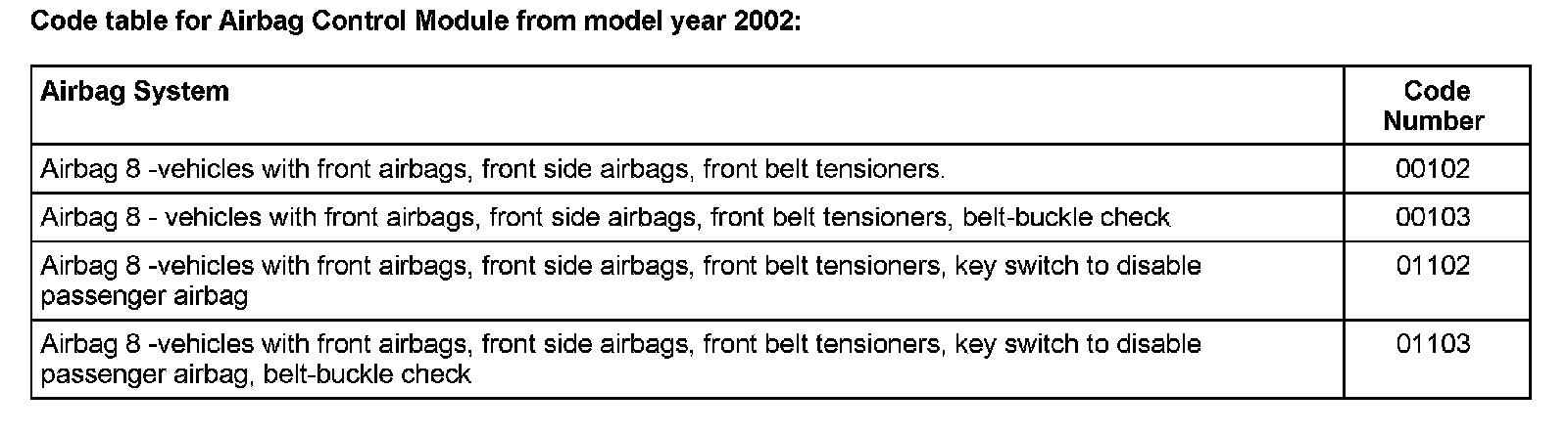 - 00102: Vehicles with front airbags, front side airbags and front belt tensioners, without key switch to disable passenger airbag