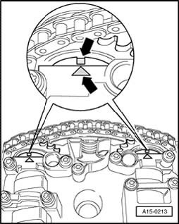 ^ Two markings on camshafts must be in line with two arrows on bearing caps (arrows).