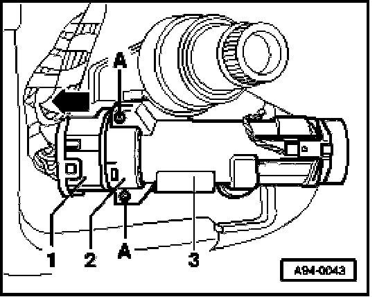 - Loosen retaining screws -A- slightly, then pull ignition/starter switch -2 out of steering lock housing -3- in direction of -arrow-.