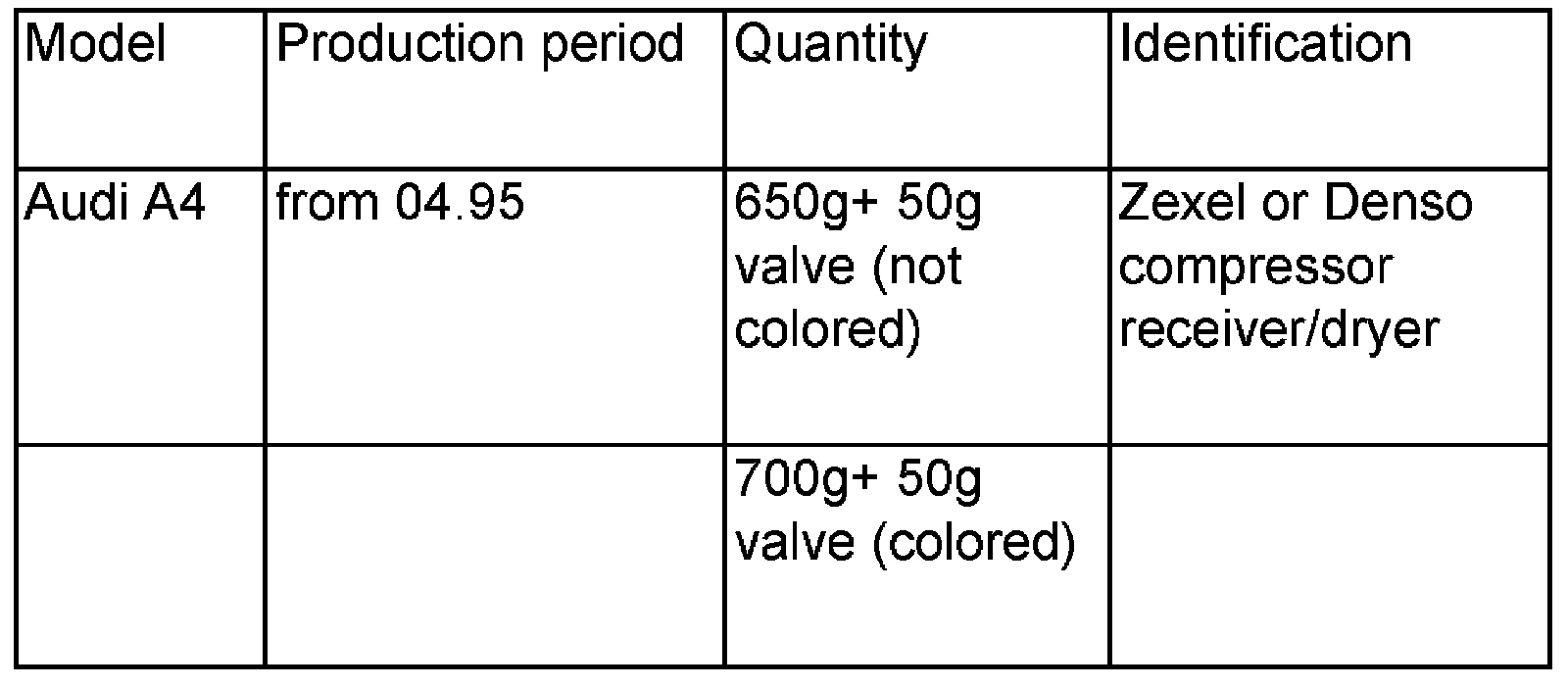 - Since 11.97, valves with different size restrictors are installed (colored yellow). Vehicles with changed valves have 50 grams more refrigerant.
