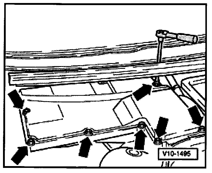 - Remove cover of E-box for control modules in plenum chamber, right side. To do this unscrew 7 screws -arrow-. For the screw at right top in illustration unclip cover in vent grill.