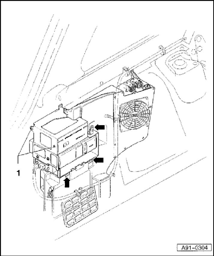 - When disconnecting harness connectors, unscrew both mounting screws (arrows) on left and right of control module for navigation with CD-mechanism -J401-, and remove it from the carrier -4-.