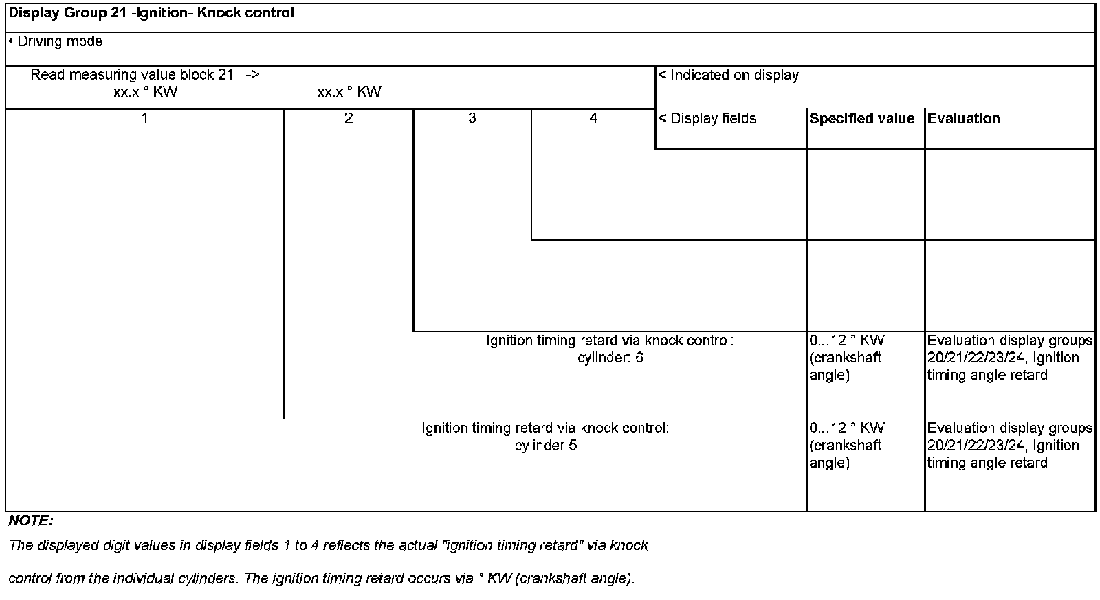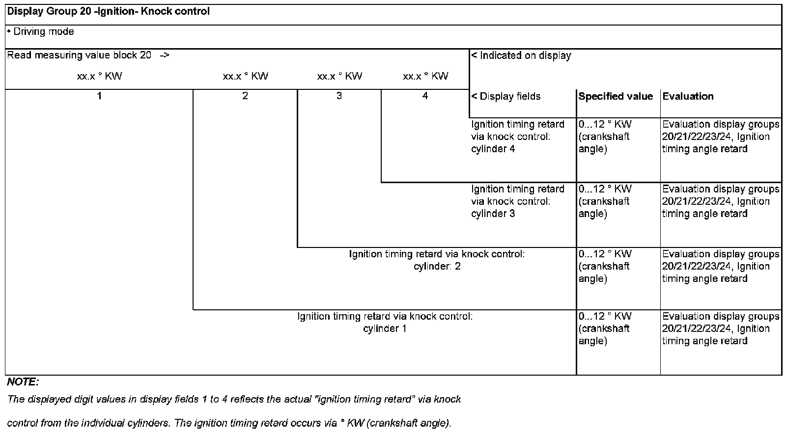 Evaluation display groups 20/21/22/23/24, - Ignition timing angle retard