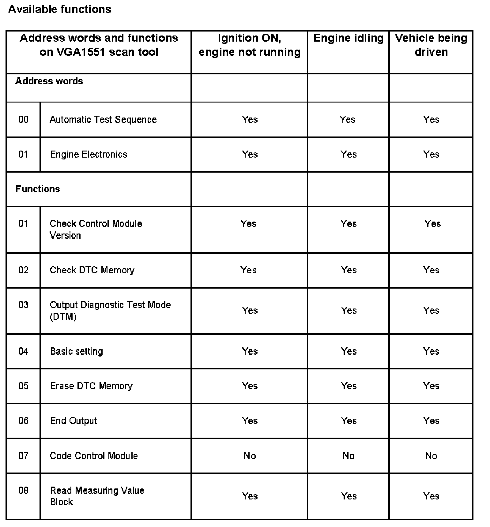Selectable Functions When Using VAG1551/1552 or VAS5051