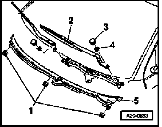 - Pull off securing clips -1- and remove cowl panel grille -5-.