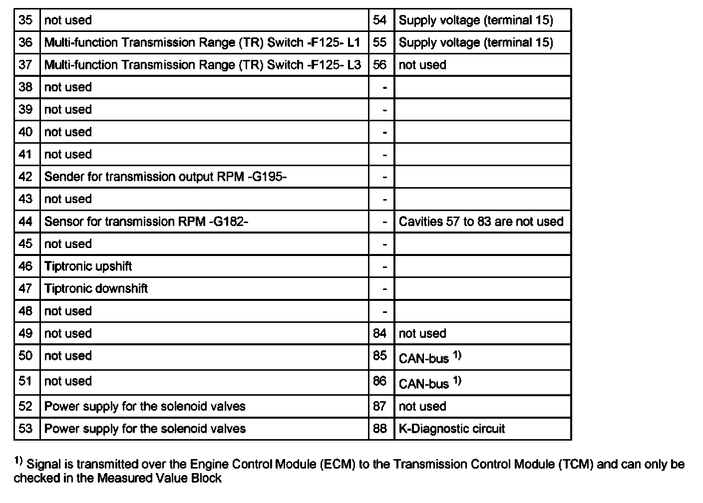 Multiple harness connector (88-pin connector) of Transmission Control Module (TCM) -J217- (cavities on V.A.G 1598/20)