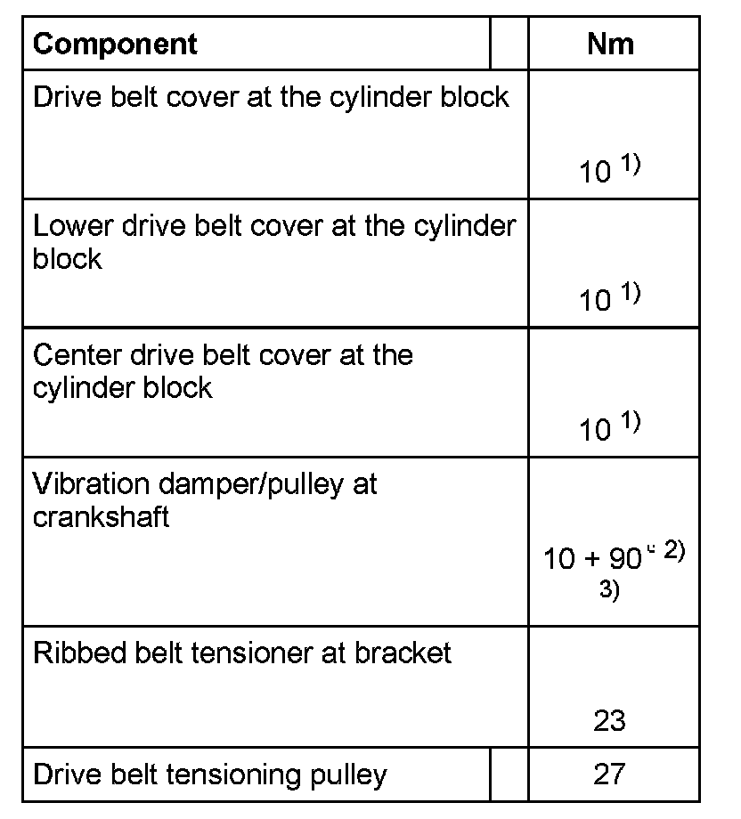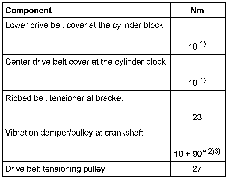 Vibration damper/pulley at crankshaft 10 Nm + 90° 2)3)