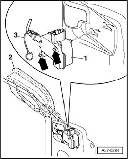 - Loosen bolts - arrows - using special tool T10010, slide actuator - 1 - toward front and remove.