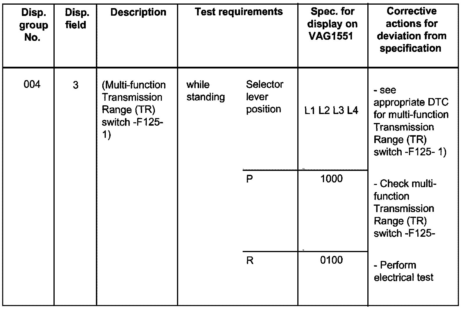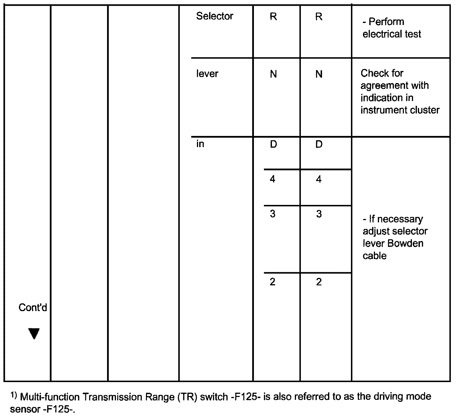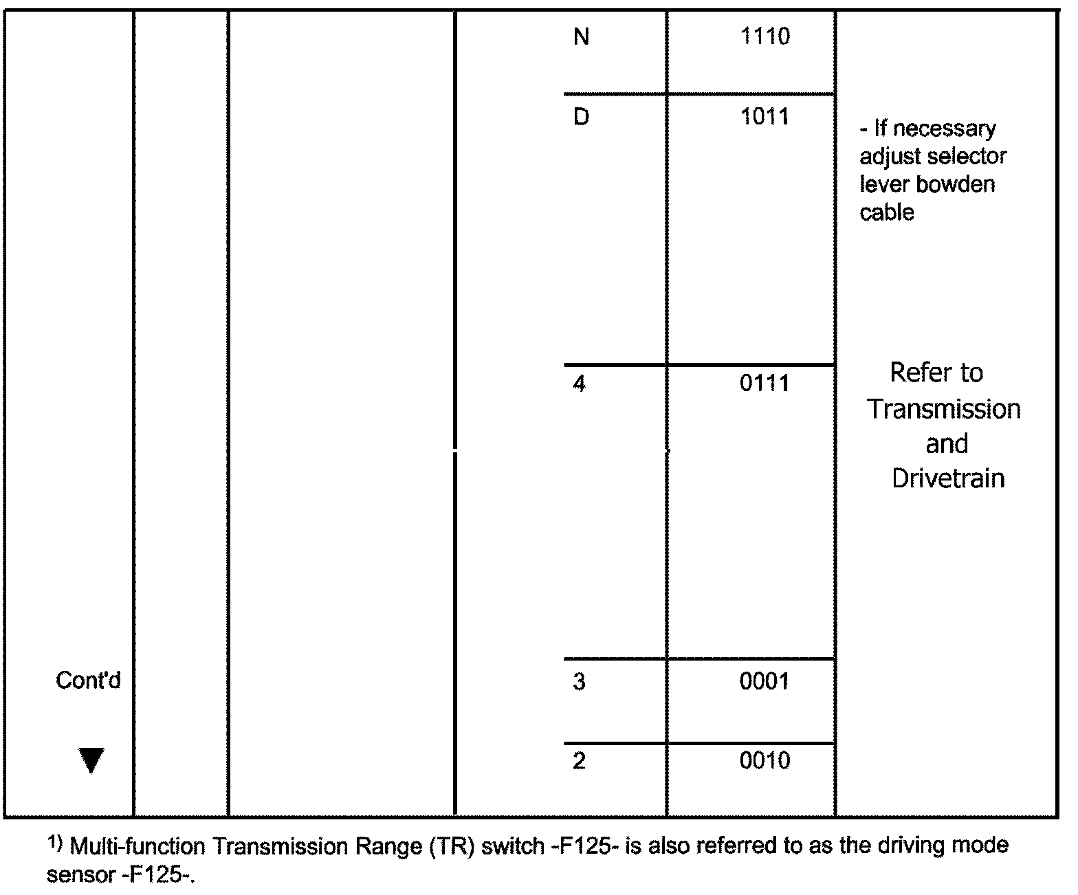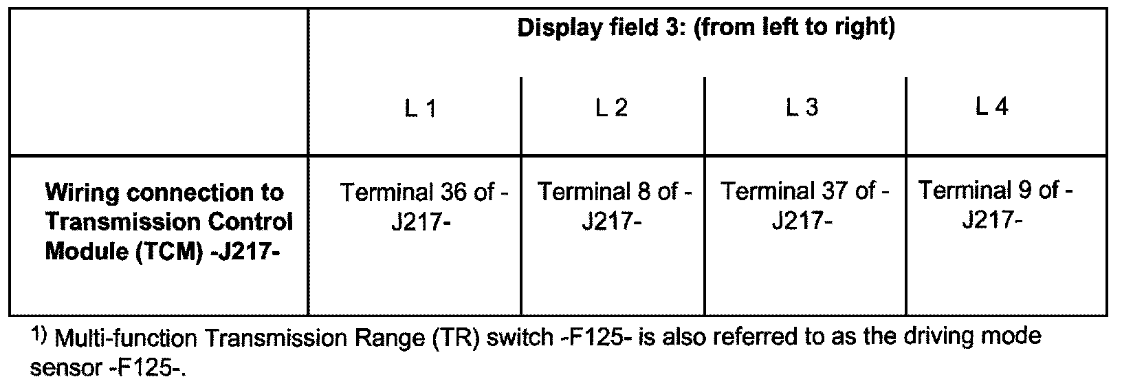^ The input signals of the Multi-function Transmission Range (TR) switch -F125- 1) can be checked at the Transmission Control Module (TCM).