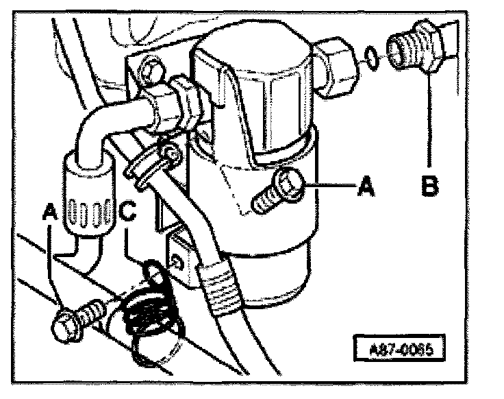 - Remove bolts -A- (tightening torque 25 Nm) and remove refrigerant lines -B- and -C-.