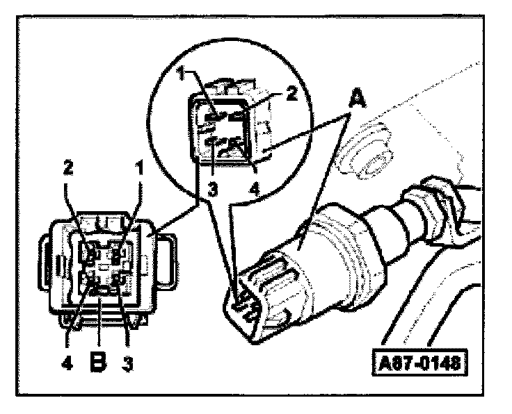 - Disconnect harness connector -B- from switch -A- and bridge terminals 1 and 2 on connector -B- See Compressor is switched on.