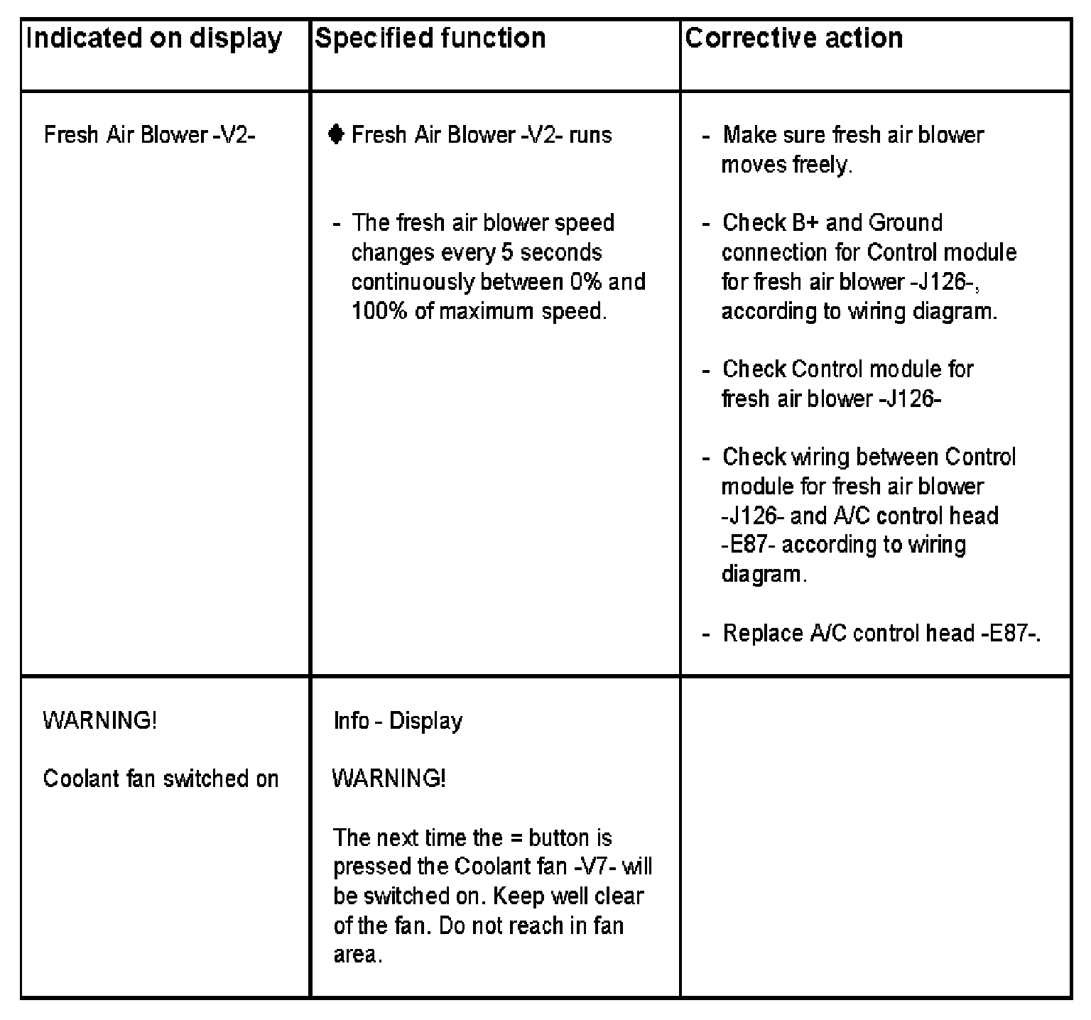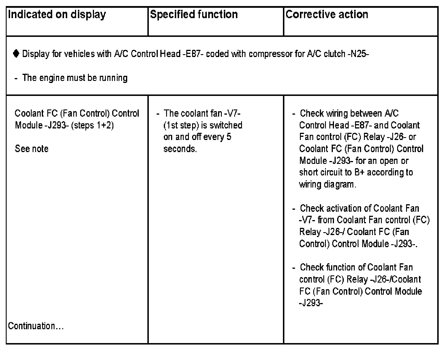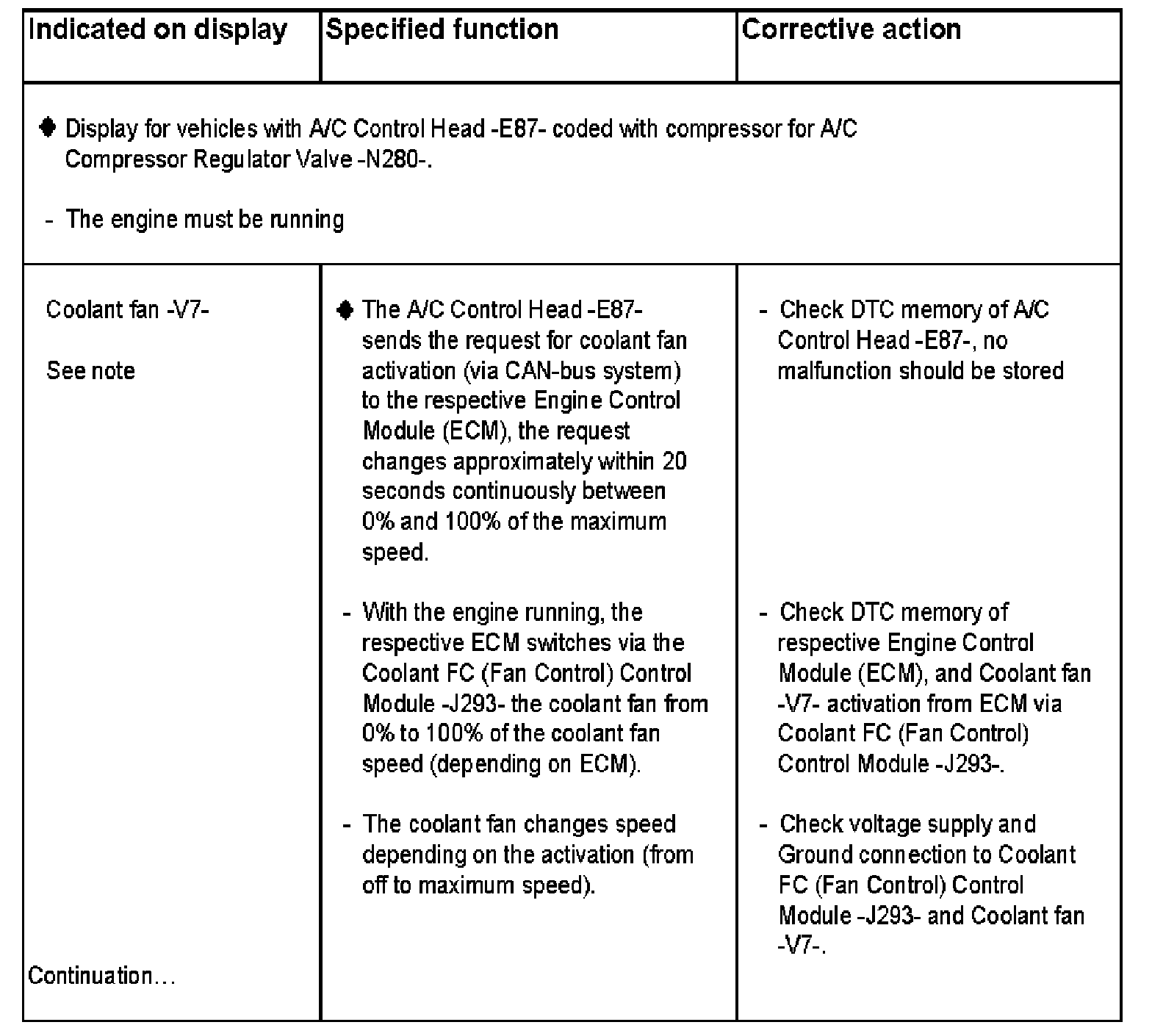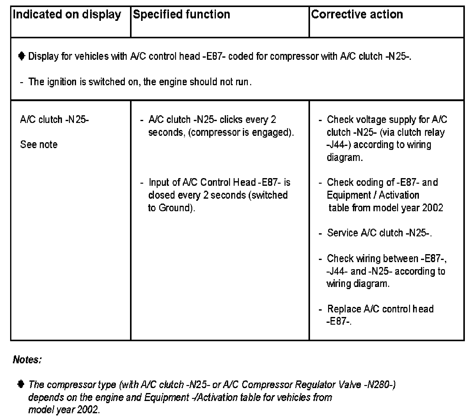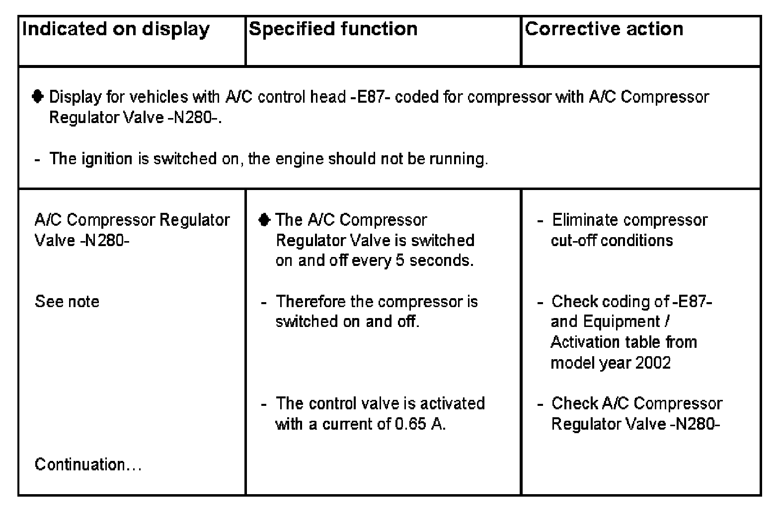 - The actuator "A/C Compressor Regulator Valve -N280" or "A/C clutch -N25" is only actuated with engine switched off These actuators will not be displayed on the VAS 5051 display and not activated by the A/C control head -E87- with the engine running.
