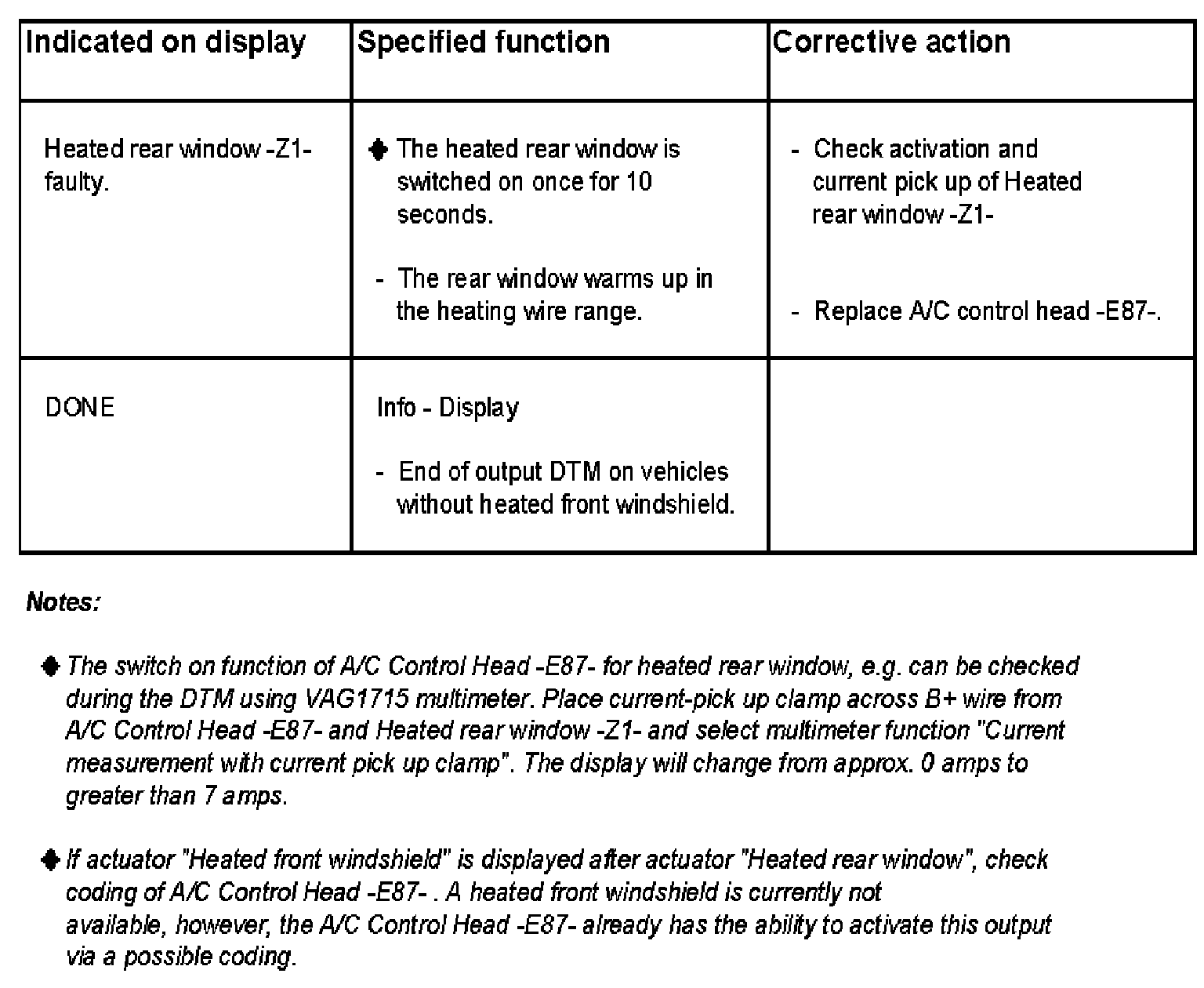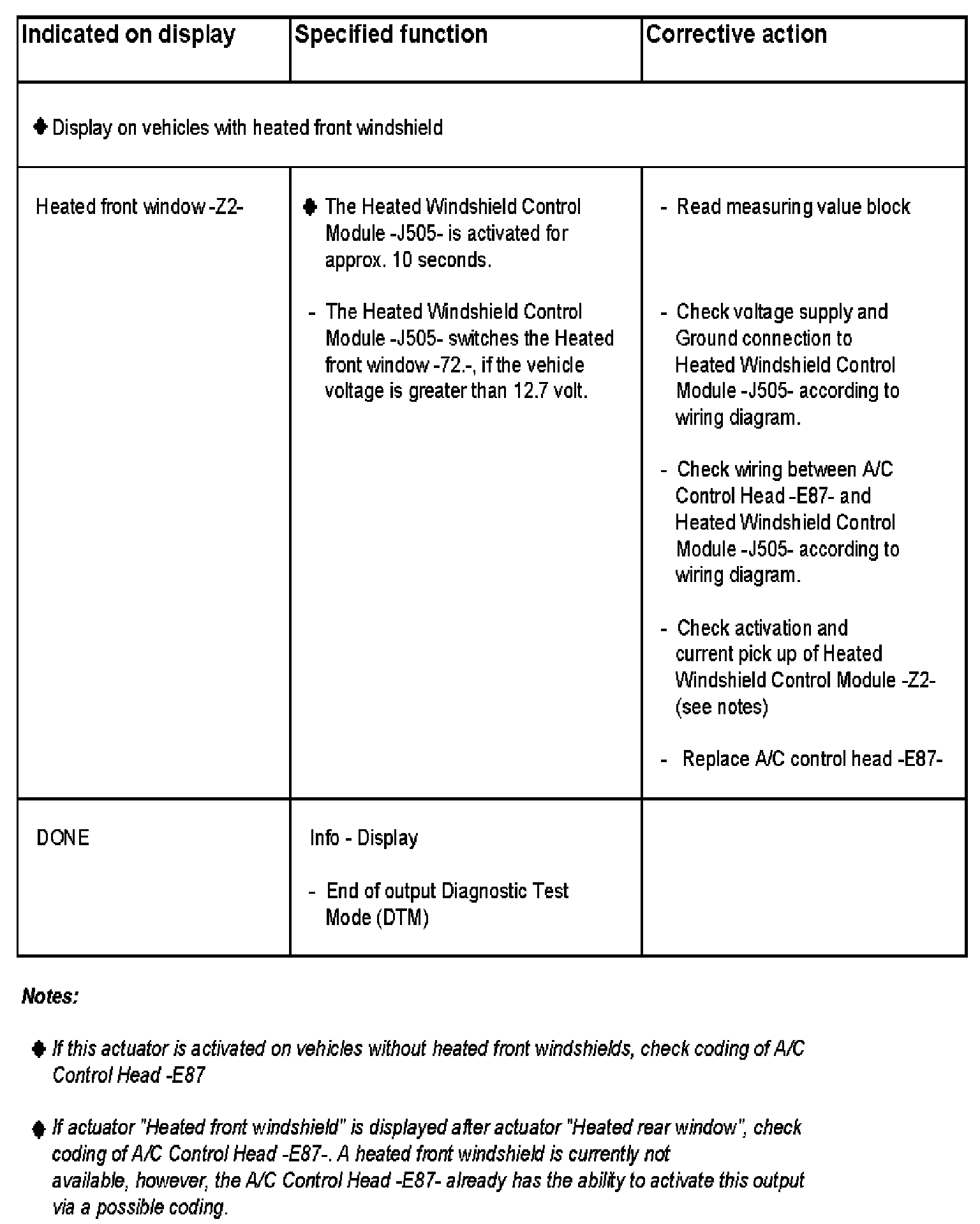 The output DTM only activates the heated front windshield if the passenger compartment temperature is less than 40 °C. If the temperature is higher, the text "Function unknown or cannot be carried out" is displayed on scan tool.