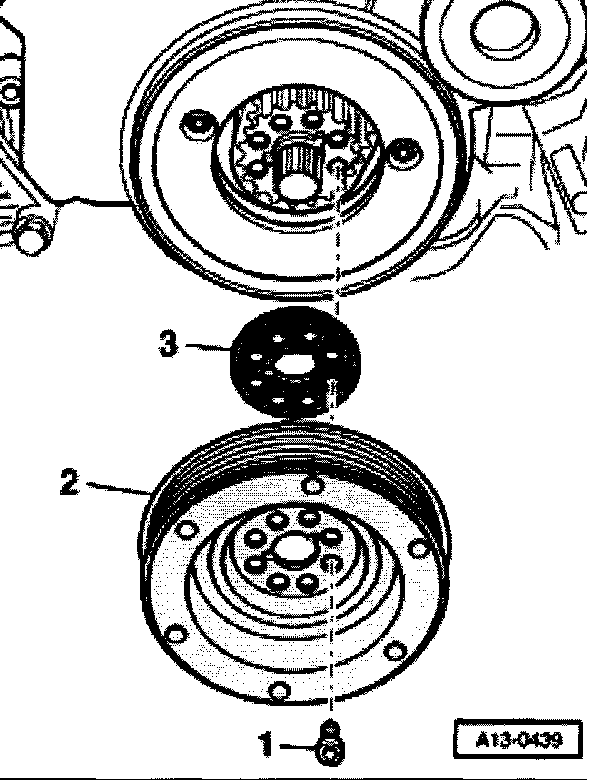 - Remove harmonic balancer-2- and thrust washer -3-.