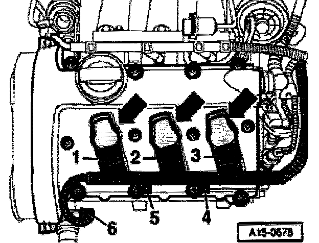- Remove bolts -5- and -6- at right cylinder head cover.
