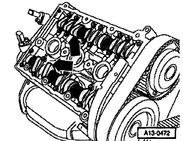 - Turn engine until the cams (arrows) at intake and exhaust camshaft of cylinder 3 (right cylinder bank) point upward uniformly.