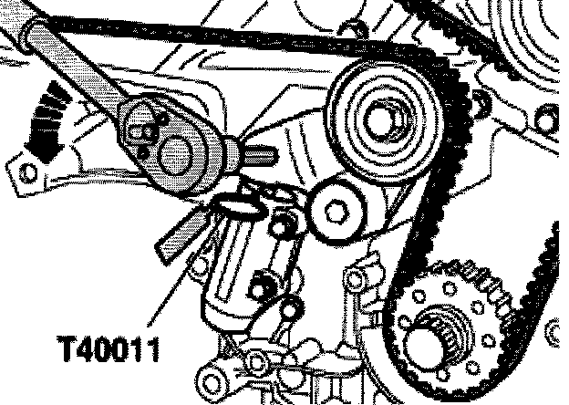 - Using an 8 mm hex socket wrench, turn toothed belt tensioner in direction of arrow until the tensioning lever pushes the tensioner together far enough so that the T40011 pin can be inserted into the bore of the pistons and housing.