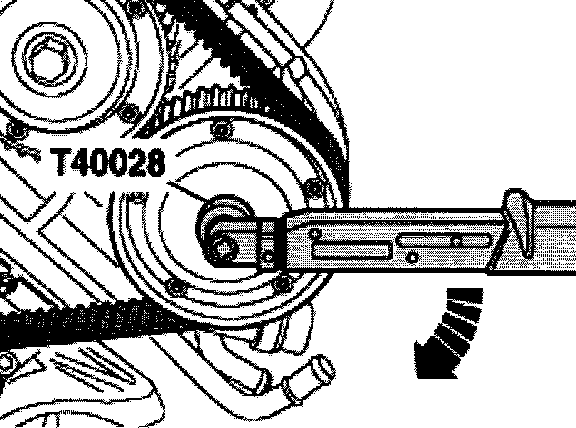 - Turn with 45 Nm in direction of arrow to pretension toothed belt.